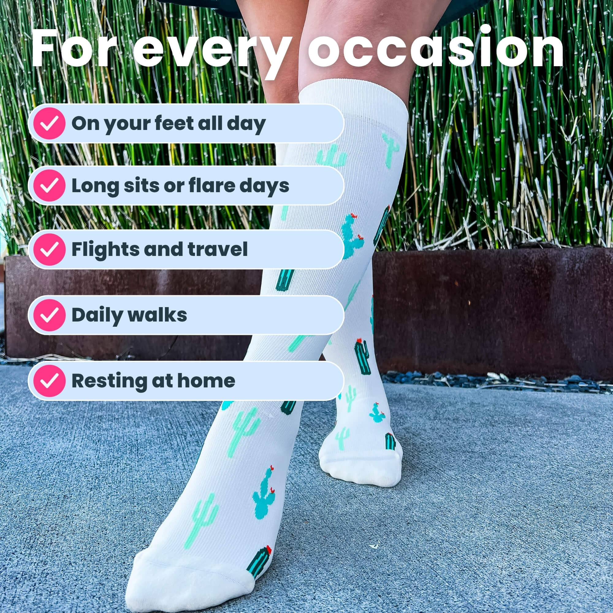 I know own 14 pairs of these socks and this cute cactus design is just the latest to my collection. I cannot recommend these more as these are all I wear. I’ve bought as many as I have so that when I’m unable to do washing, I know I have plenty clean until I can do my next load. I have ME/CFS with dysautonomia and a whole host of other complications. My cardiologist recommended compression socks but the ones I found were so expensive and clinical. I couldn’t stand the idea of being stuck in them. I’d never worn or really owned ‘fun’ socks before and I don’t think I can ever go back now. My legs feel so much less heavier, blood no longer pools in my feet, my ankles are in less pain and every time I see my feet I smile!